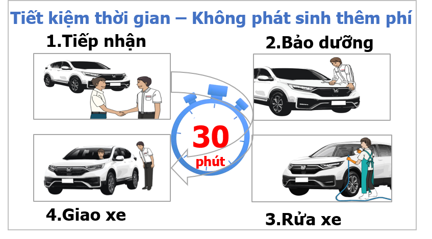 - Các đại lý của Honda cũng phục vụ KH với dịch vụ bảo dưỡng nhanh nhằm tiết kiệm thời gian chờ đợi cho KH với chi phí không đổi.