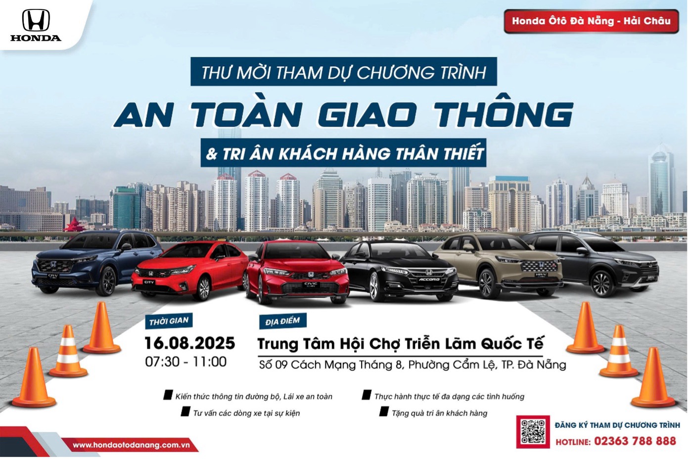 Theo kế hoạch của Honda Ôtô Đà Nẵng - Hải Châu và được sự đồng ý của Phòng LXAT HVN, vào ngày 16/08/2025, tại Trung Tâm Hội Chợ Triển Lãm TP. Đà Nẵng sẽ diễn ra khóa huấn luyện An Toàn Giao Thông (ATGT) & Tri ân khách hàng thân thiết thường niên 2025 do Honda Ôtô Đà Nẵng - Hải Châu tổ chức. Chương trình nhằm nâng cao lý thuyết, kiến thức thực tế cũng như hỗ trợ thêm những kỹ năng cho khách hàng đã và sẽ sử dụng xe ô tô Honda.